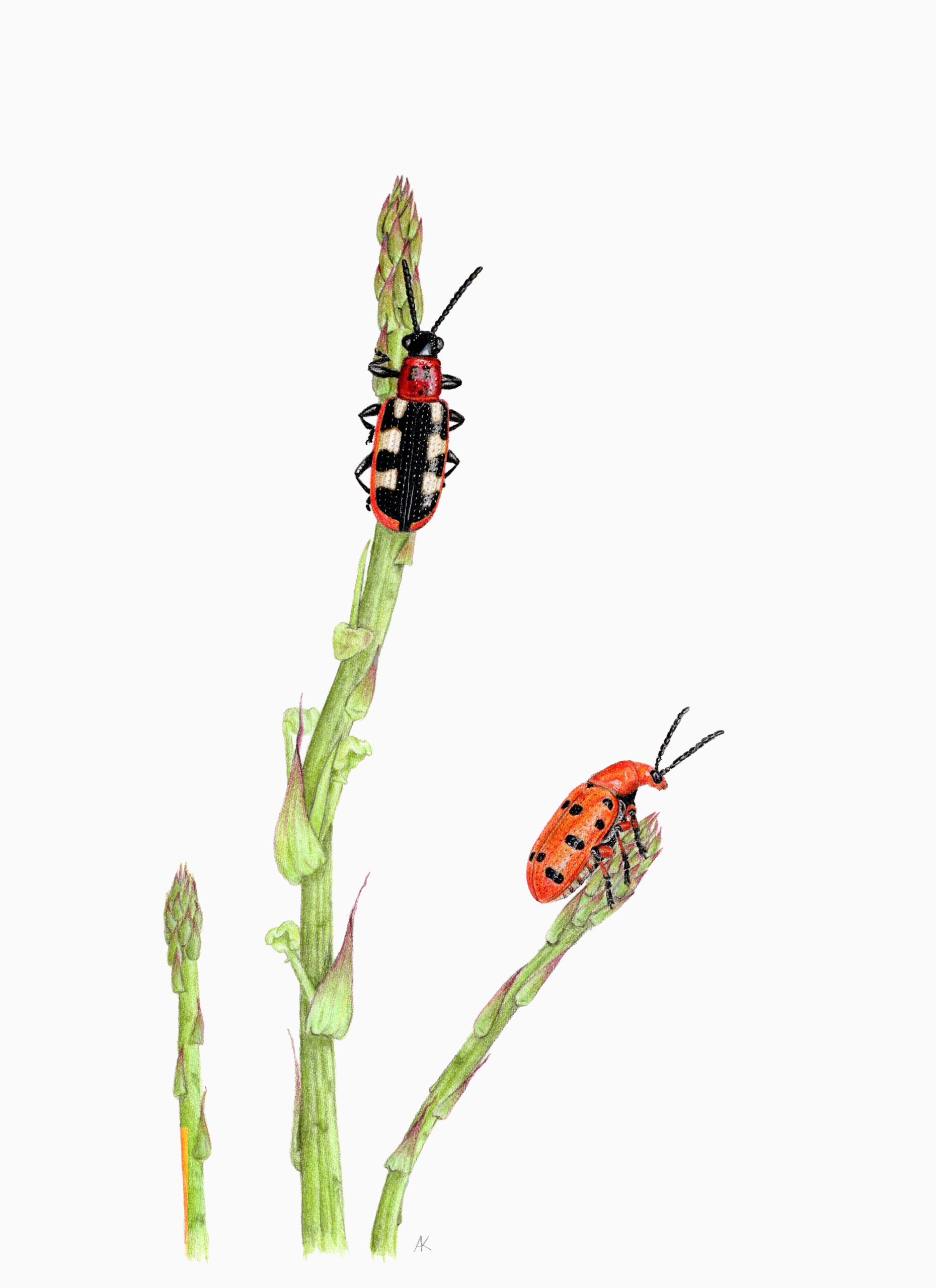 This fine art print depicts two asparagus beetle species on asparagus: Crioceris asparagi & Crioceris duodecimpunctata