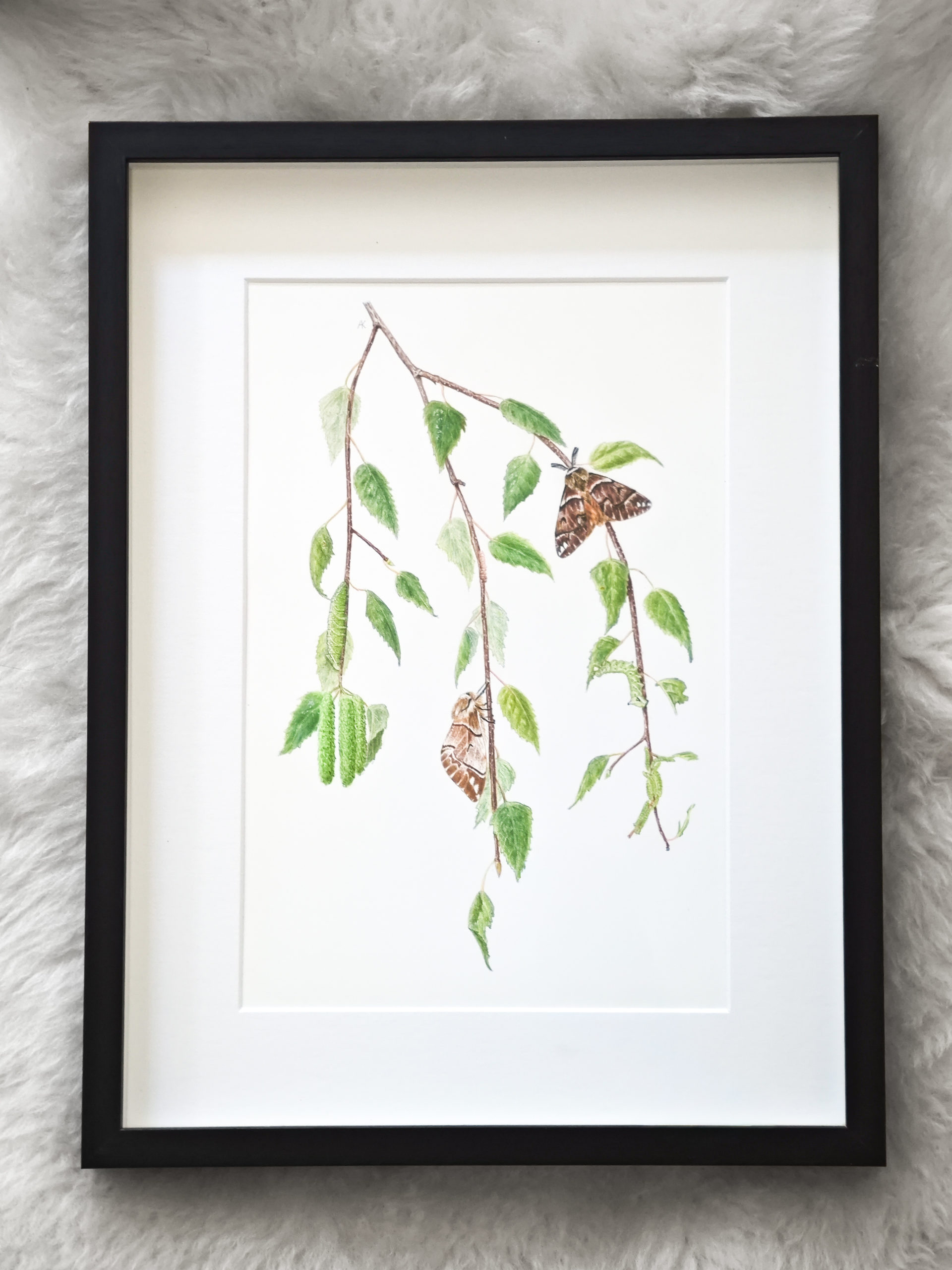 Framed original drawing – Kentish glory on silver beech (Metamorphosis series)