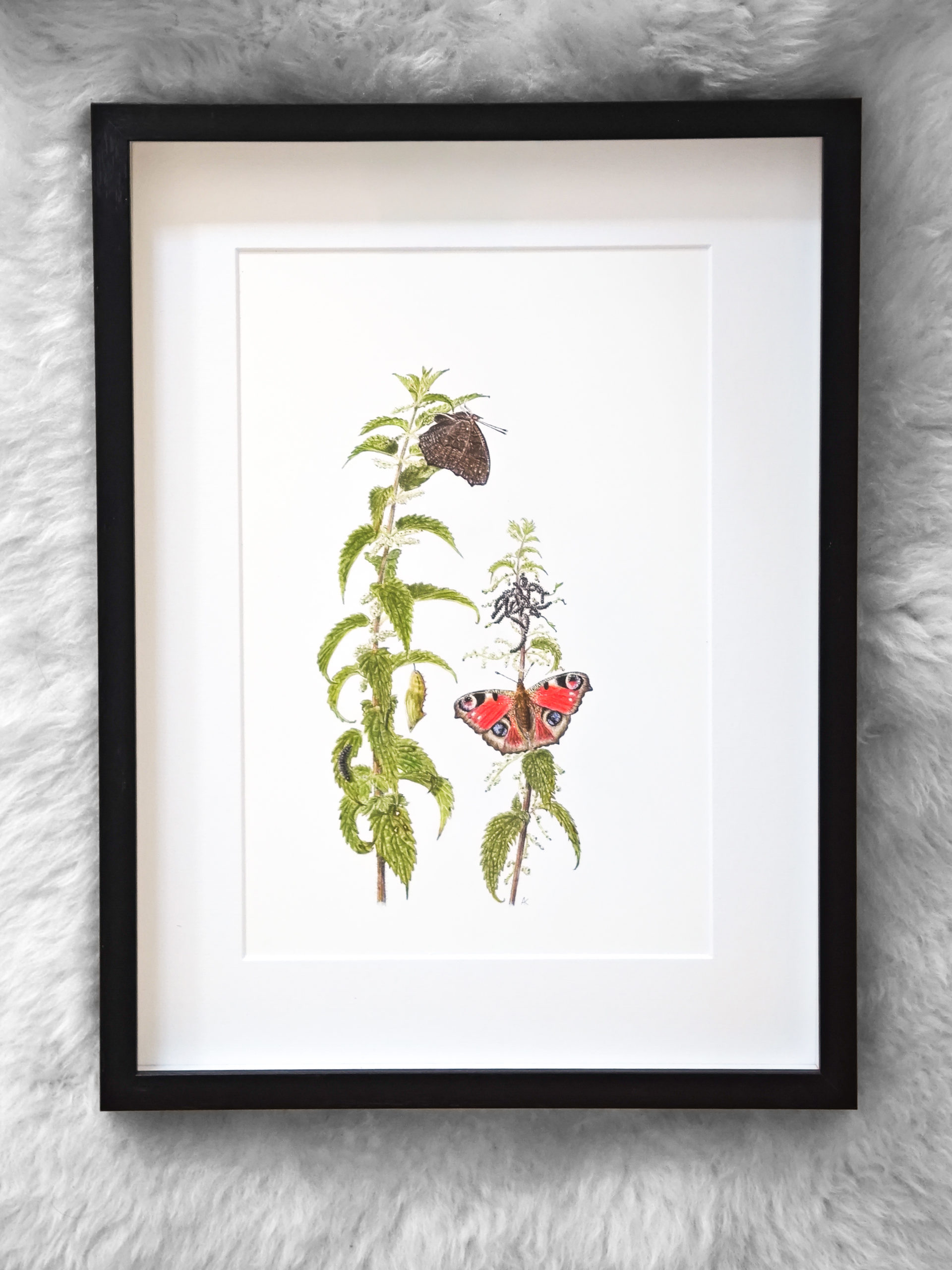 Framed original drawing – Peacock butterfly on nettle (Metamorphosis series)